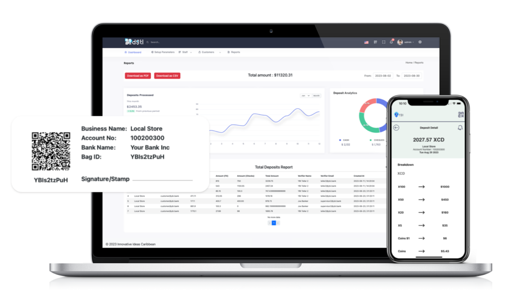 Digital deposit slips are linked to each QR Code, Institution (Bank or CU), and Customer